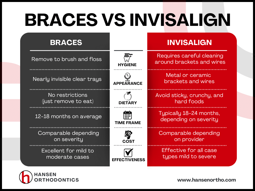When it comes to straightening your smile, you’ve got options. For most people it’s going to come down to: Braces vs Invisalign. Both are proven methods to correct alignment issues, but they differ in appearance, comfort, cost, and treatment process. Choosing between braces or Invisalign depends on your lifestyle, budget, and the complexity of your dental needs.